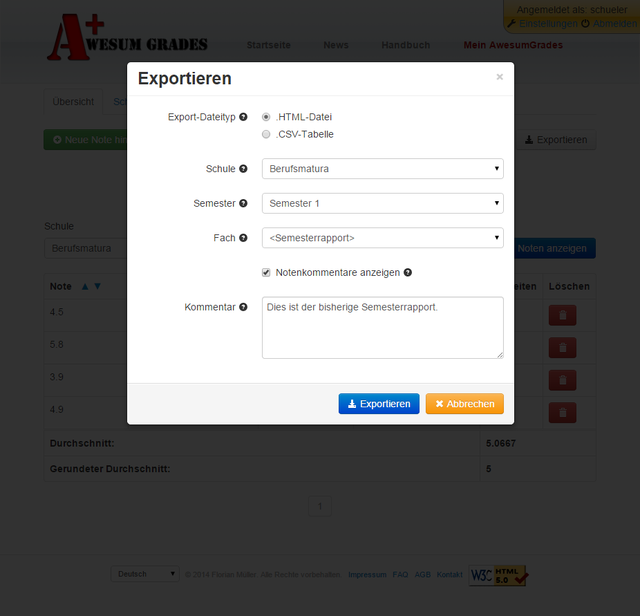 Für gewisse Noten können Rapporte (oder Exporte) erstellt werden. Diese dienen insbesondere dazu, wenn über die Noten Rechenschaft abgelegt werden muss (zum Beispiel dem Lehrmeister oder den Eltern). Dazu kann über die Schaltfläche "Exportieren" oben rechts das Export-Menü geöffnet werden, mittels welchem ein Export erzeugt werden kann.