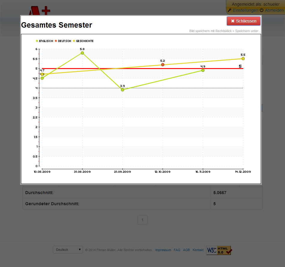 - Ausgewähltes Fach in allen Semestern: Zeigt alle Noten eines Faches in einer Schule an, ungeachtet der Semester.