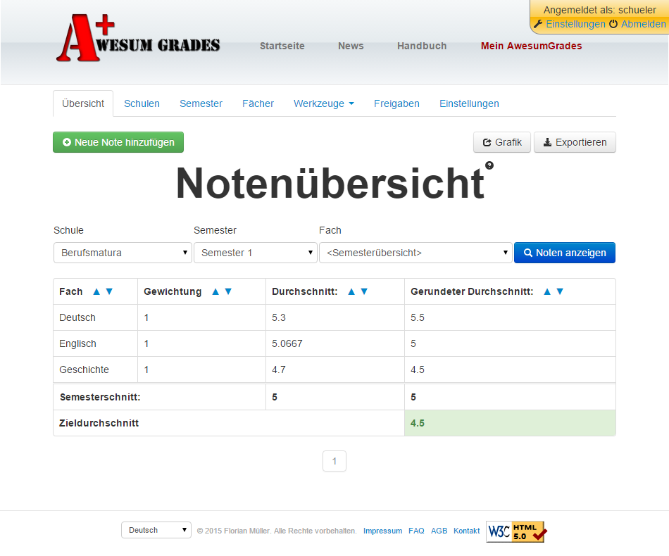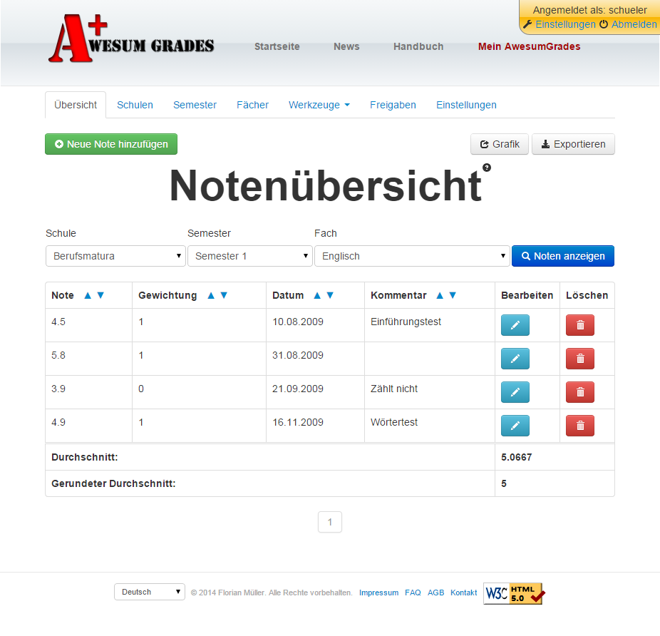 Die Übersicht wird jedes mal direkt geöffnet, wenn sich der Benutzer bei AwesumGrades anmeldet. Auf dieser Übersicht können alle erfassten Noten geordnet angezeigt werden.