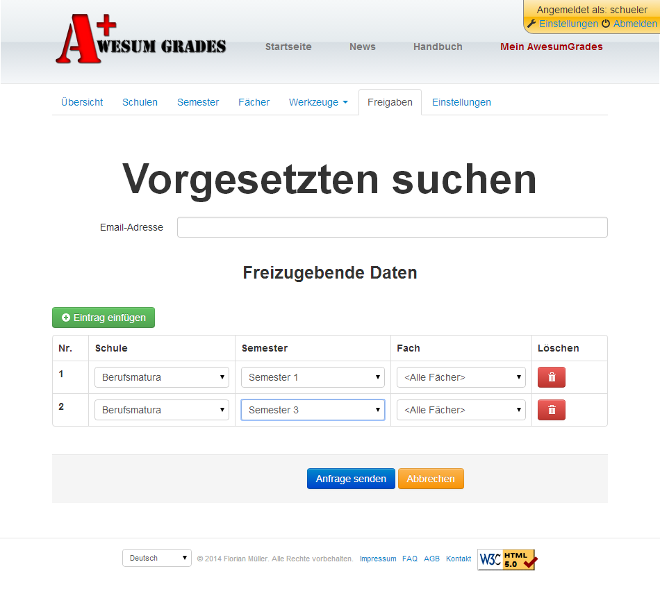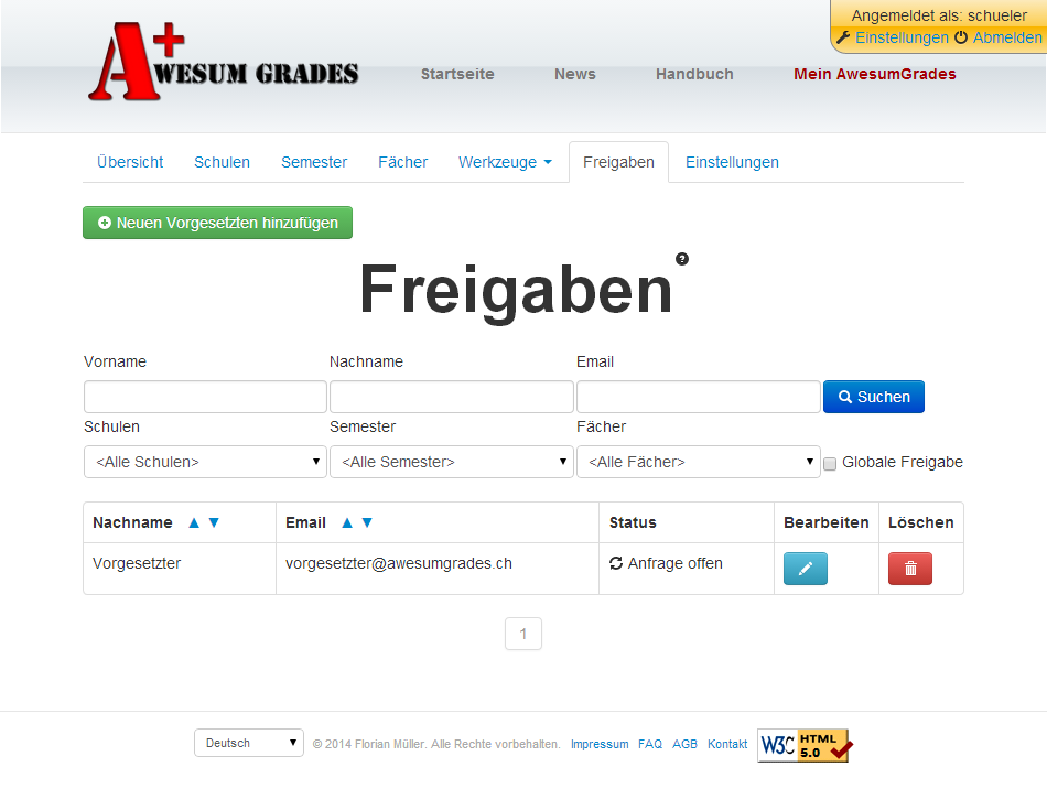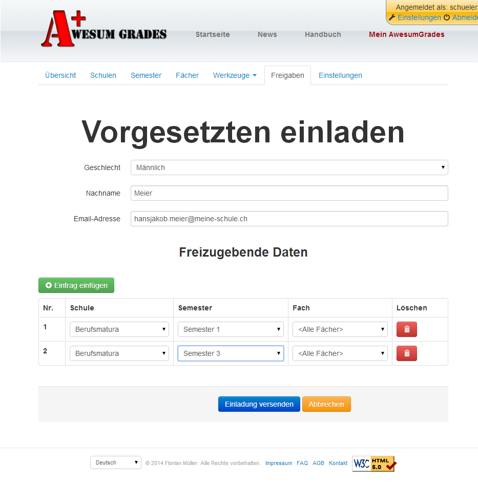 Registrierte vorgesetzte Person anfragenVia Klick auf den Button "Neuen Vorgesetzten hinzufügen" und danach auf "Einen angemeldeten Vorgesetzten suchen" gelangst du auf die nachfolgende Maske, welche dir erlaubt, einen bereits registrierten Vorgesetzten anhand seiner Email-Adresse zu finden. Darunter kannst du die Daten spezifizieren, welche dieser vorgesetzten Person freigegeben werden sollen. Wenn du einen Standardeintrag belässt (alle Schule, Semester und Fächer) ist das eine "Globale Freigabe" und bedeutet, diese vorgesetzte Person hat Einsicht in all deine erfassten Daten (und in all die Daten, die du noch erfassen wirst, solange diese Freigabe besteht). Noch nicht registrierte Person zu AwesumGrades.ch einladenSollte die vorgesetzte Person noch nicht registriert sein, kannst du diese einladen. Via Klick auf den Button "Neuen Vorgesetzten hinzufügen" und danach auf "Einen Vorgesetzten zu AwesumGrades einladen" gelangst du auf die nachfolgende Maske, welche dir erlaubt, eine vorgesetze Person direkt mit einer Freigabeanfrage zu AwesumGrades einzuladen. Dazu musst du einige Daten der vorgesetzten Person sowie deine gewünschten Freigabeeinstellungen angeben. Wenn sich die eingeladene vorgesetzte Person mit der angegebenen Email-Adresse registriert, wird automatisch eine Freigabeanfrage erstellt. |