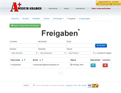 HandbuchNächste benötigte Note berechnen - Einstellungen FreigabenAuf dem Tab "Freigaben" kannst du all deine erfassten Freigaben anschauen, verwalten und neue erfassen. Was sind Freigaben?Mittels Freigaben hast du die Möglichkeit, einer vorgesetzten Person (beispielsweise deinem Chef, Lehrer, Berufsbildner oder sogar deinen Eltern) alle oder Teile deiner Noten freizugeben. Dabei kannst du beliebig einstellen, was genau sie sehen dürfen und was nicht. Vorgesetzte Personen können ausschliesslich Daten anzeigen und auswerten, nicht aber hinzufügen, bearbeiten oder löschen. Daten anzeigenMittels Klick auf den Button "Suchen" kannst du dir alle erfassten Freigaben anzeigen lassen. Optional kannst du mit den daneben befindlichen Feldern die Suche eingrenzen. Um eine vorgesetzte Person hinzuzufügen, gibt es zwei Varianten.