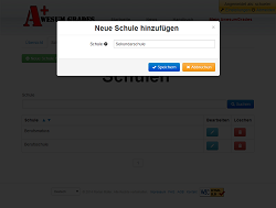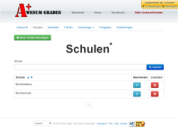 HandbuchSchulenAuf dem Tab "Schulen" können alle Schulen erfasst, bearbeitet und verwaltet werden. Daten anzeigenMittels Klick auf den Button "Suchen" können alle erfassten Schulen angezeigt werden. Optional können nur Schulen gesucht werden, die einen bestimmten Text im Namen haben (Filterfeld links vom Such-Button). Neue Schule hinzufügenUm auch Noten eintragen zu können, wird unter anderem die dazugehörige Schule benötigt. Diese kann mittels Klick auf den Button "Neue Schule hinzufügen" eingetragen werden. Benötigt wird nur der Name der Schule. Schule bearbeiten / löschenUm eine Schule zu bearbeiten oder zu löschen, muss sie zuerst in der Tabelle gesucht werden. Mittels Klick auf den blauen Stift kann die Schule bearbeitet werden. Mittels Klick auf den roten Abfalleimer kann die Schule (nach erneuter Nachfrage) gelöscht werden. Wenn eine Schule gelöscht wird, werden alle zugeordneten Noten ebenfalls gelöscht! |