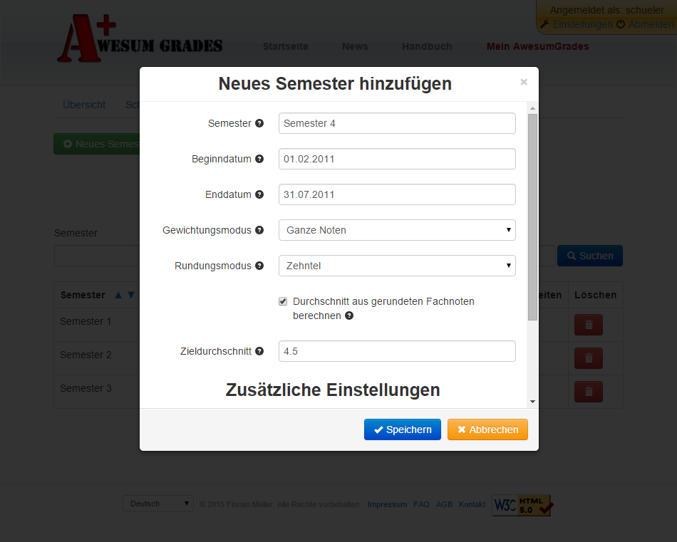 Mittels Klick auf den Button "Speichern" kann das Semester gespeichert werden.