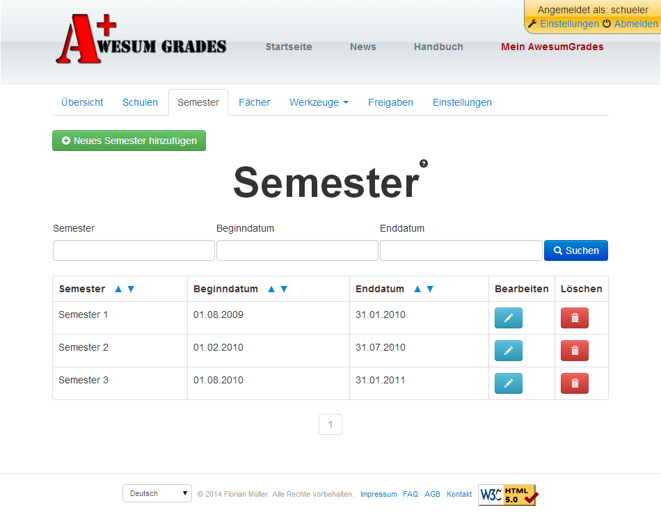 Um ein Semester zu bearbeiten oder zu löschen, muss es zuerst in der Tabelle gesucht werden. Mittels Klick auf den blauen Stift kann das Semester bearbeitet werden. Mittels Klick auf den roten Abfalleimer kann das Semester (nach erneuter Nachfrage) inklusive aller Noten in diesem Semester gelöscht werden.